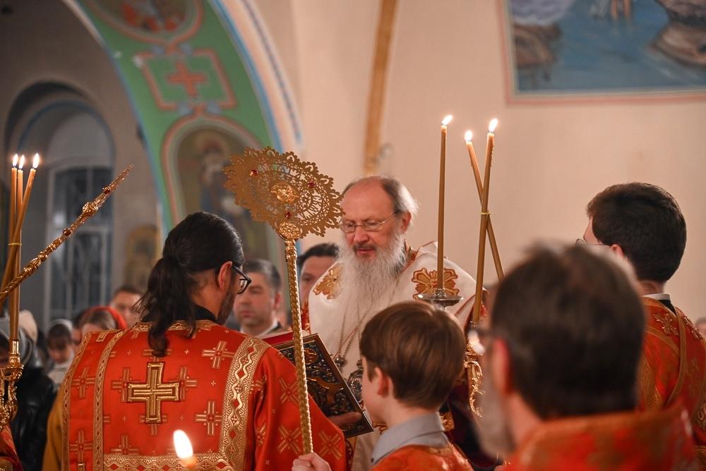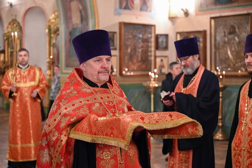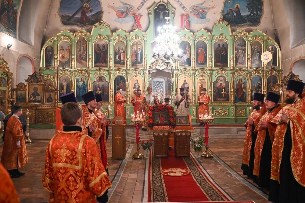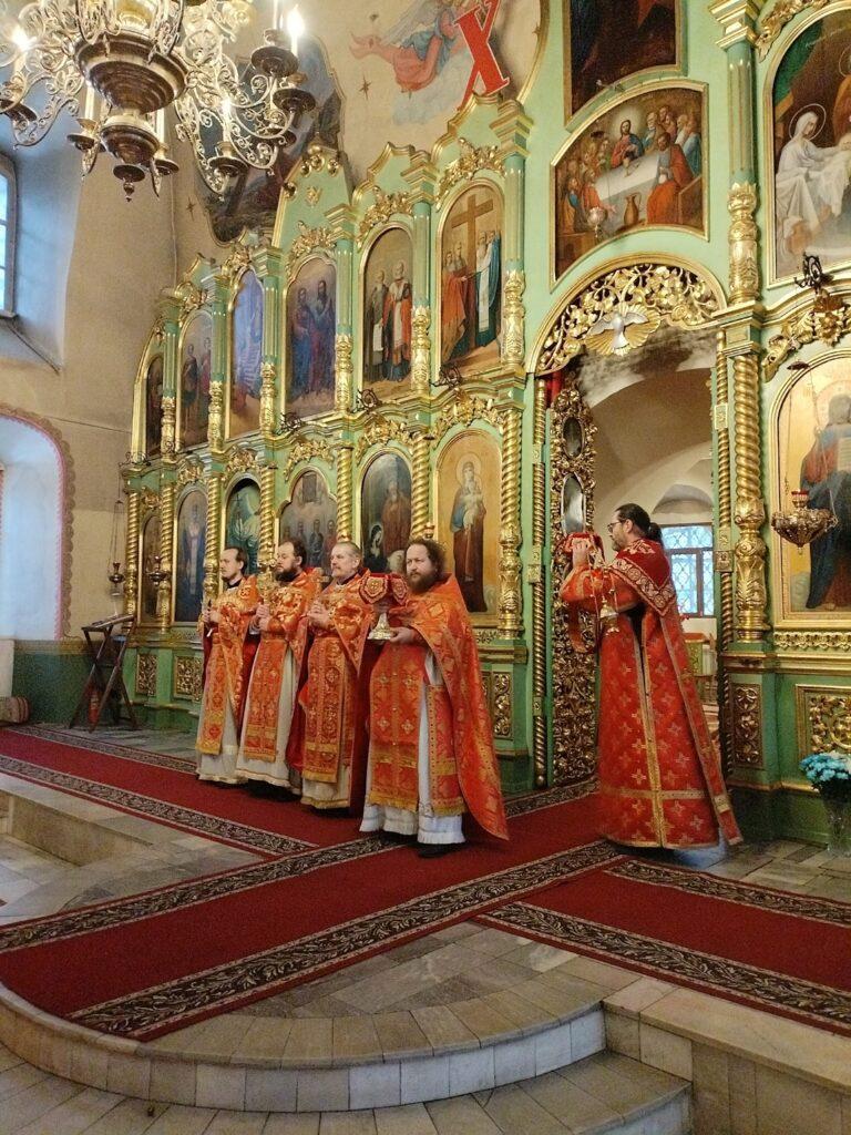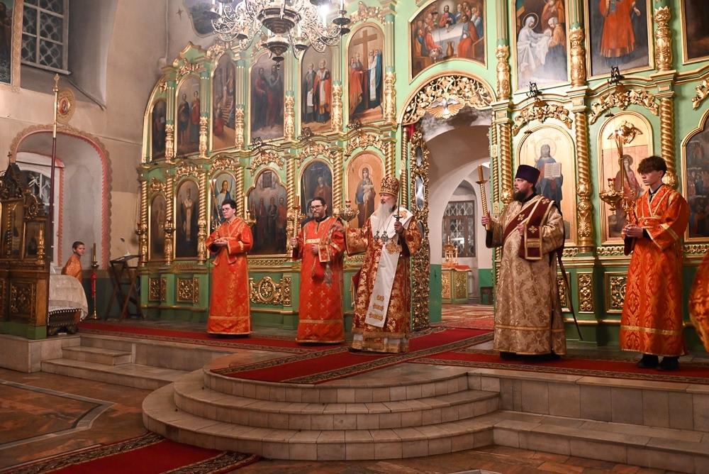 Его Высокопреосвященству сослужили секретарь Вятской епархии иерей Виталий Лапшин, благочинный Слободского церковного округа протоиерей Евгений Смирнов, настоятель Екатерининского кафедрального собора протоиерей Сергий Пентин, клирики храма иерей Сергий Ходырев, иерей Валентин Харин, иерей Алексий Бордзеловский. Богослужебные песнопения прозвучали в исполнении хора под управлением матушки Елены Матвеевой.